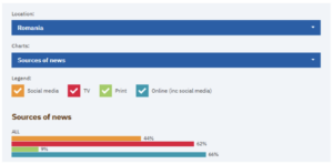 In den sozialen Medien sucht das Publikum nicht aktiv nach Nachrichten. Stattdessen finden Nachrichten ihr Publikum. Wir werden mit Informationen und Meinungen zu öffentlichen Angelegenheiten konfrontiert, wenn die Algorithmen der sozialen Plattformen einige zufällige Inhalte als relevant für uns identifizieren – neben Katzen, Hunden, Essensbildern, Make-up-Reels, Bildern mit Freunden und natürlich Werbung. Trotz dieser bekannten Mängel gab fast die Hälfte der rumänischen Stichprobe an, soziale Medien für Nachrichten zu nutzen, während sechs von zehn auch „Fernsehen“ als Informationsquelle angaben.
