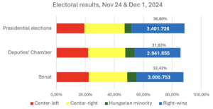Die Radikalisierung der Unzufriedenen bei den Wahlen in Rumänien im November und Dezember 2024. Von den fast 9,5 Millionen anwesenden Wählern wählten 3 Millionen Wähler rechte Parteien für das neue rumänische Parlament. Quelle: Daten der Ständigen Wahlbehörde, mit eigenen Berechnungen.